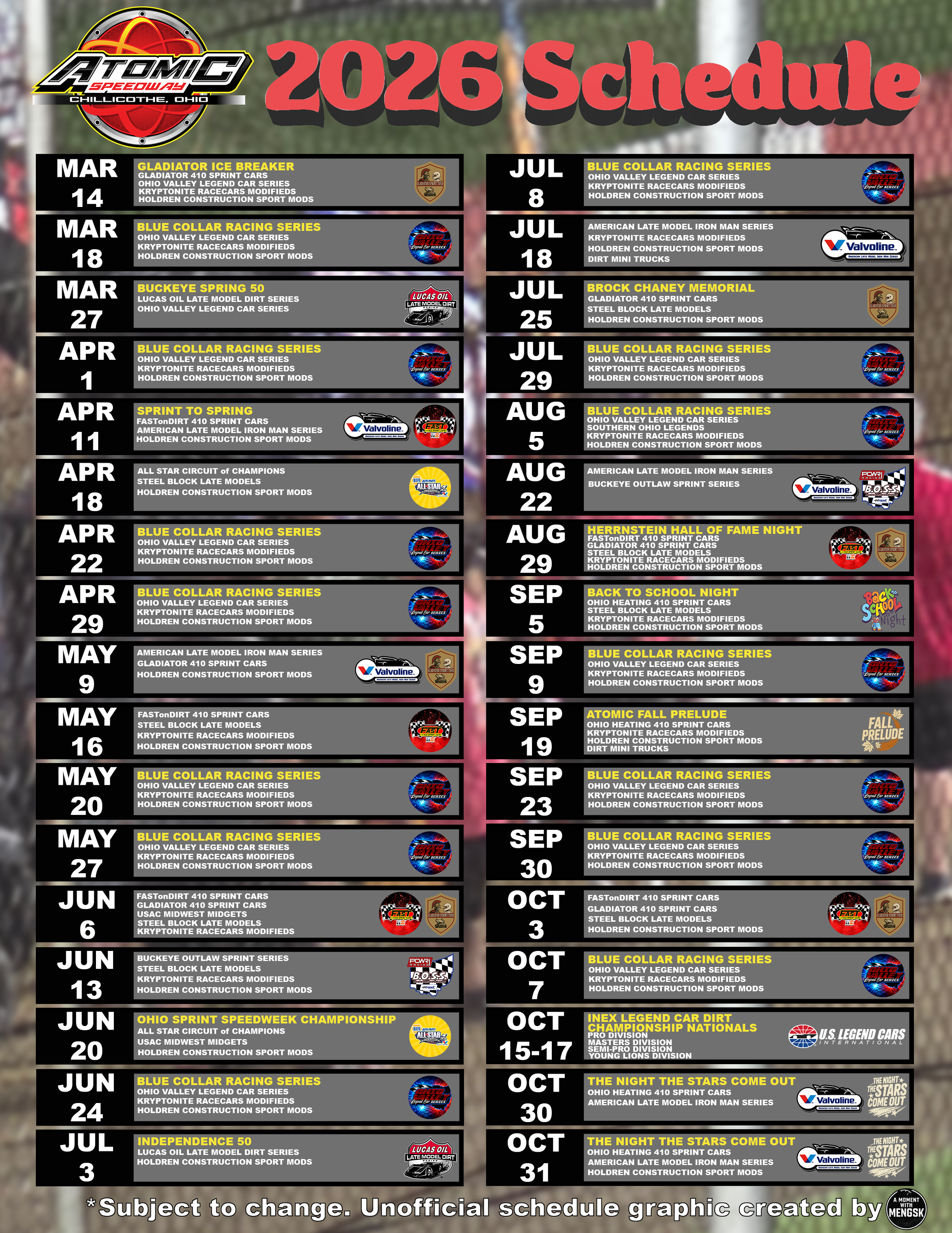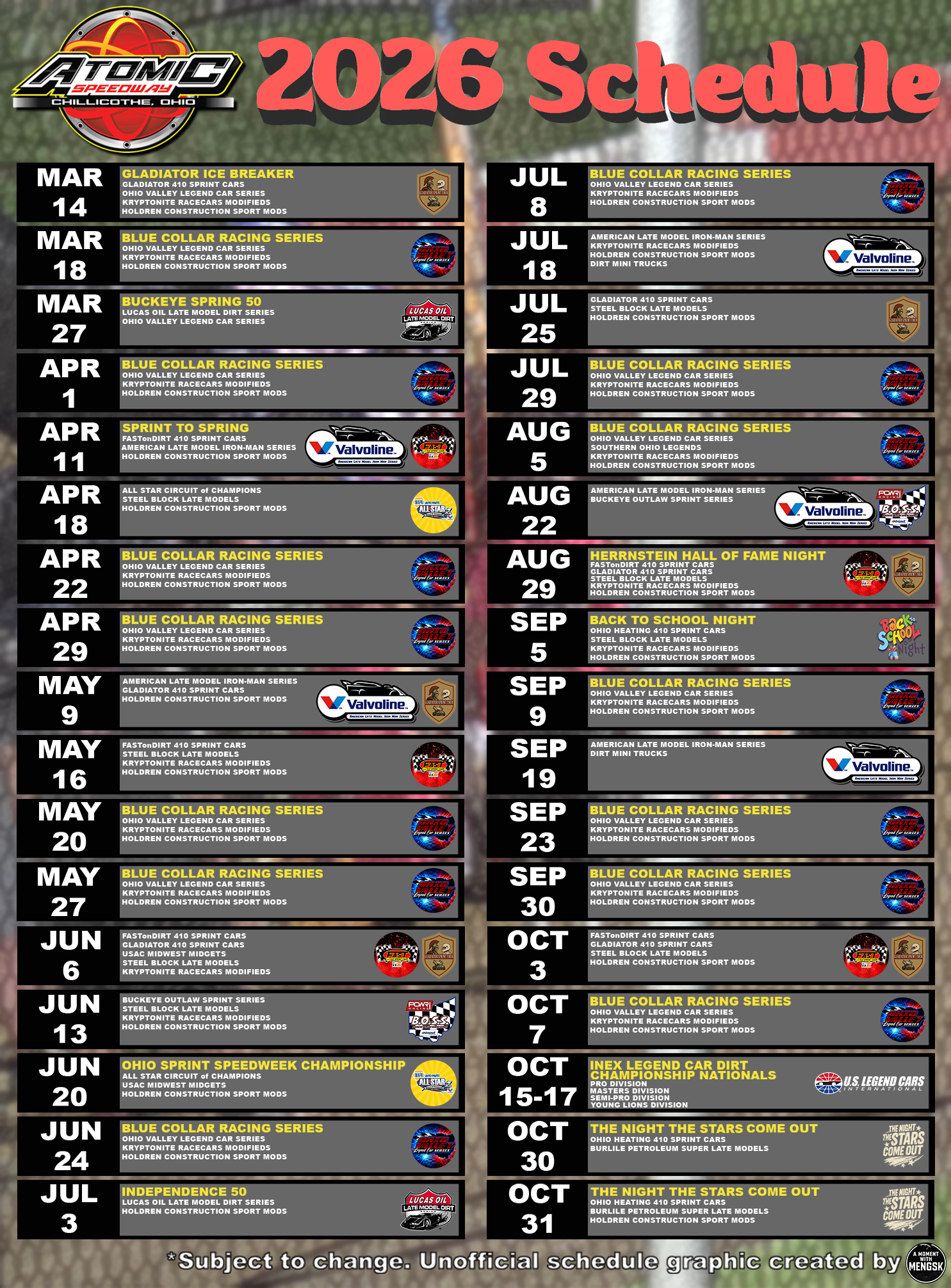 And now here we are, staring down the 2026 season. A schedule that feels like a blend of everything Atomic has ever been. Big national shows, midweek racing, local divisions that give the place its heartbeat, and a few nights that carry more weight than the rest. It’s a season that feels like a continuation of the track’s history, not just another year on the calendar.